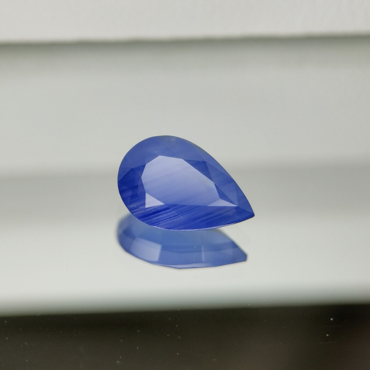 全体にシルクインクルージョンがあるため柔らかで優しい印象のブルーで、斜めにたくさんの層のシルクインクルがあり、角度によってシルクの布のようなきめ細やかな光沢が楽しめます。
