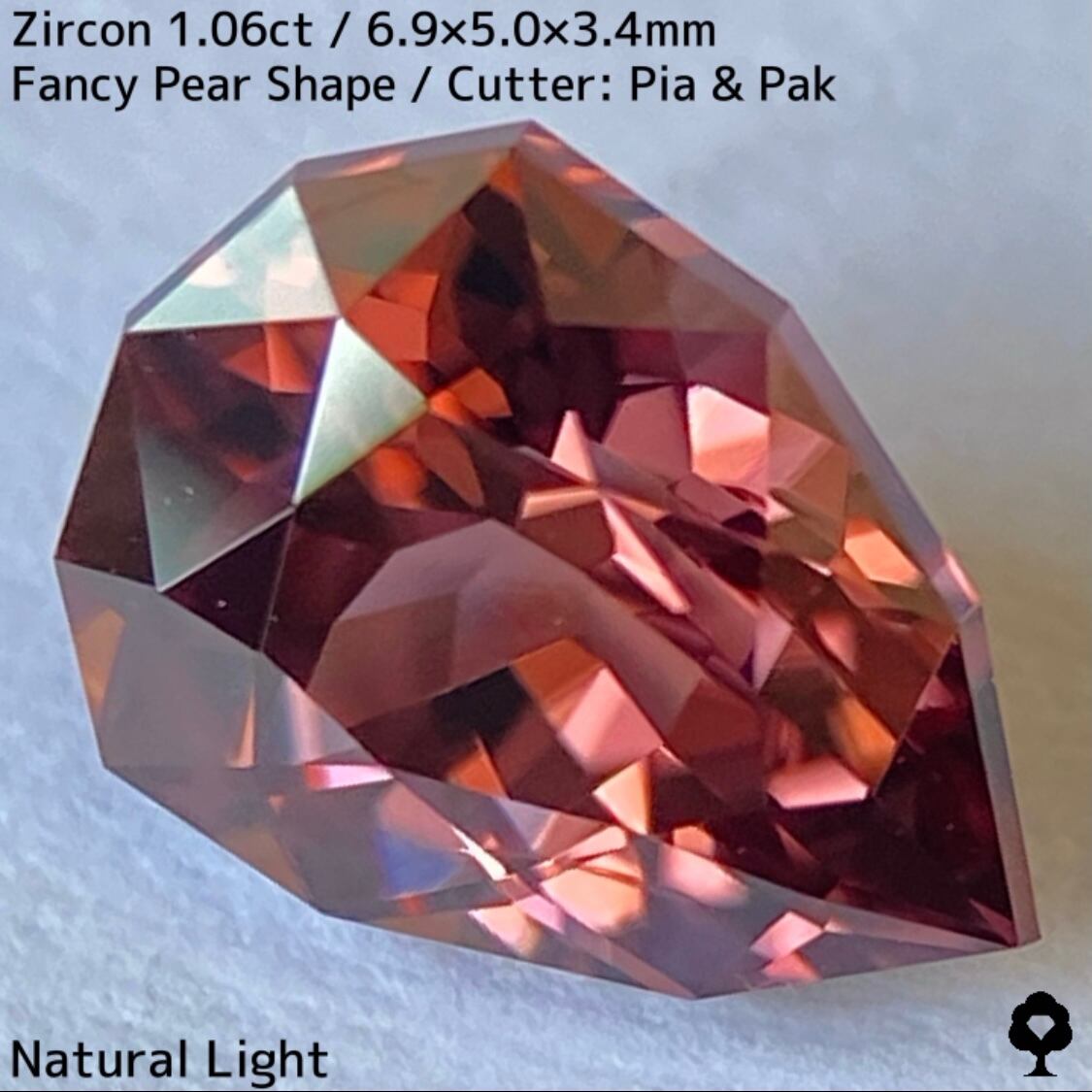 オレンジ・パープル・ピンクが混ざり合ったような複雑な大人っぽい色合いがたまらないジルコンで、分散度の高いジルコンらしくカラフルなファイアーもチラつきます。