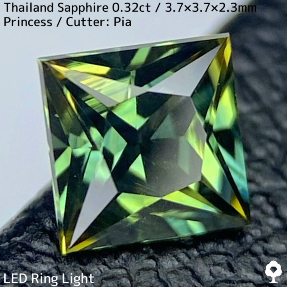 一方タイ産のサファイアはイエローベースにブルーの色だまりがあることによって多色感あるグリーンの非常にクリアな一石です。