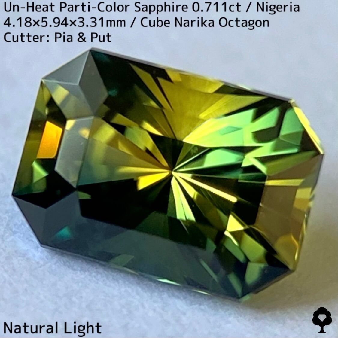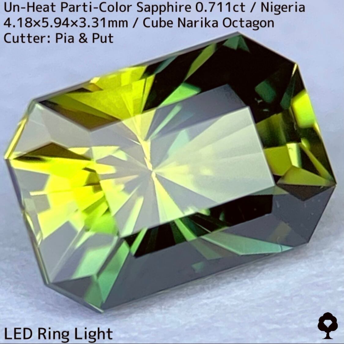 タイ語で時計を意味するナリカーカットに仕上げられた一石で、抜群の透明度のイエローの部分にインディゴの色合いが反射して混ざり合い、軽く色がカクテルされたイエローとグリーンの煌めきがとても美しいです。