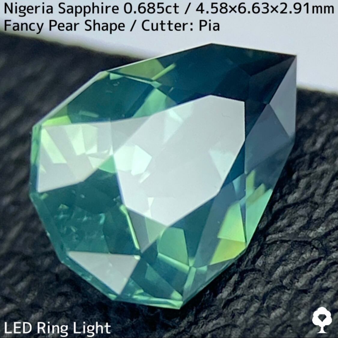 ナイジェリア産の非加熱サファイアで、深みのあるグリニッシュブルーを基調とした色合いに先端からグラデーションのようにシルキーブルーが覆い、丸みのある側に細やかで強いグリーンの煌めきが溢れます。