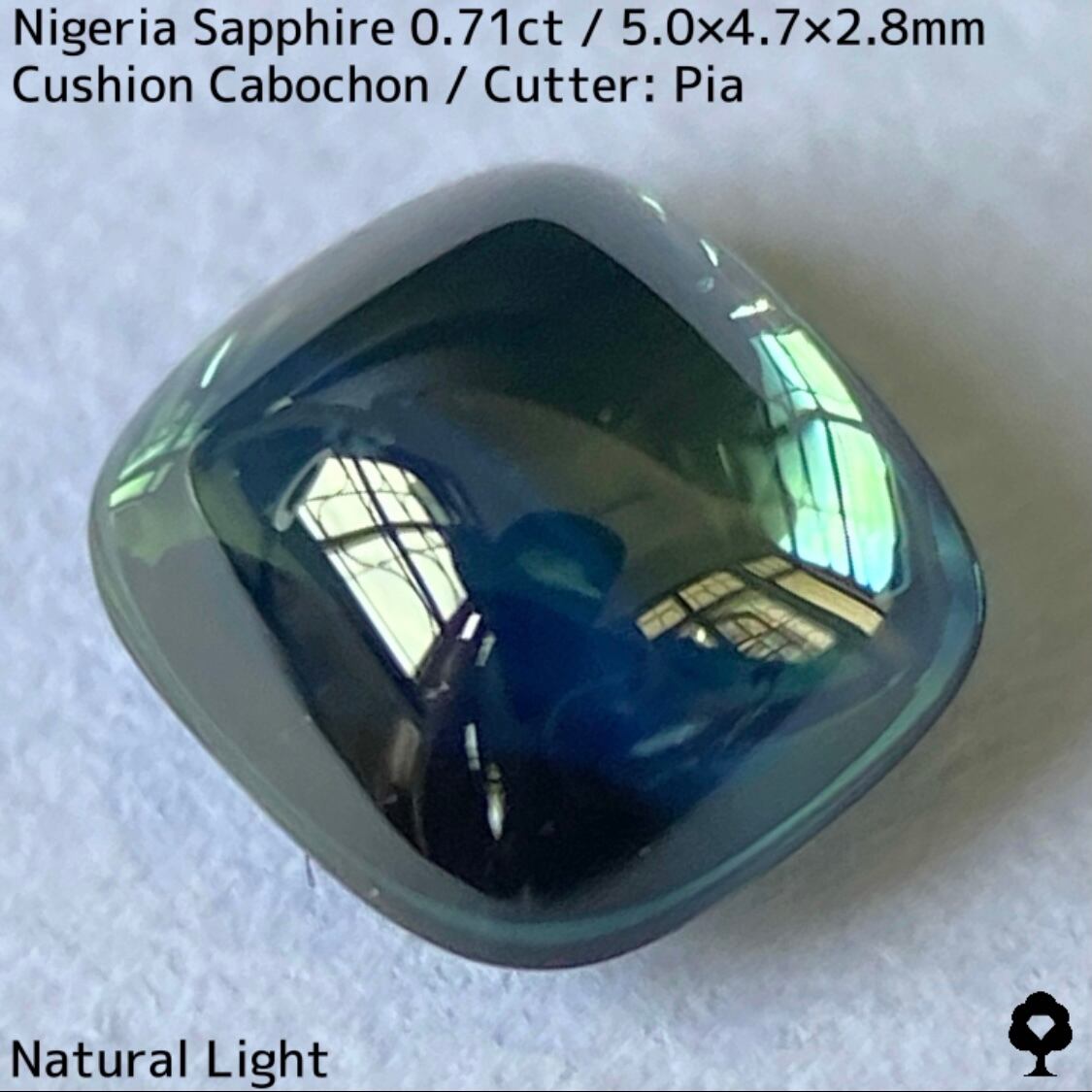 明るい美色ブルーイッシュグリーンとブルーのゾーンがあるナイジェリア産サファイアで、ブルーのゾーンにはシルキーな成長線が走るクッションのカボションです。