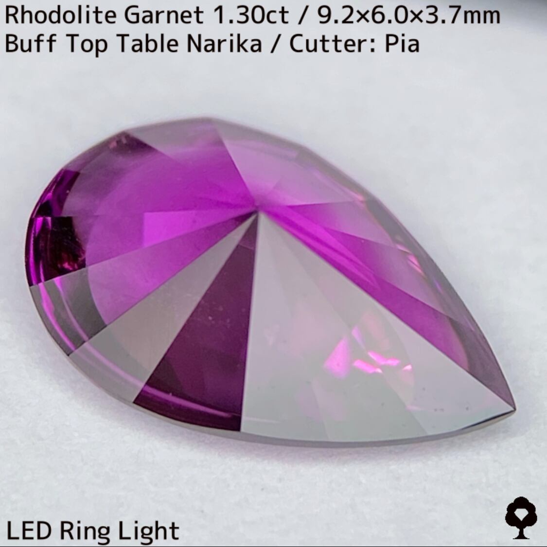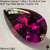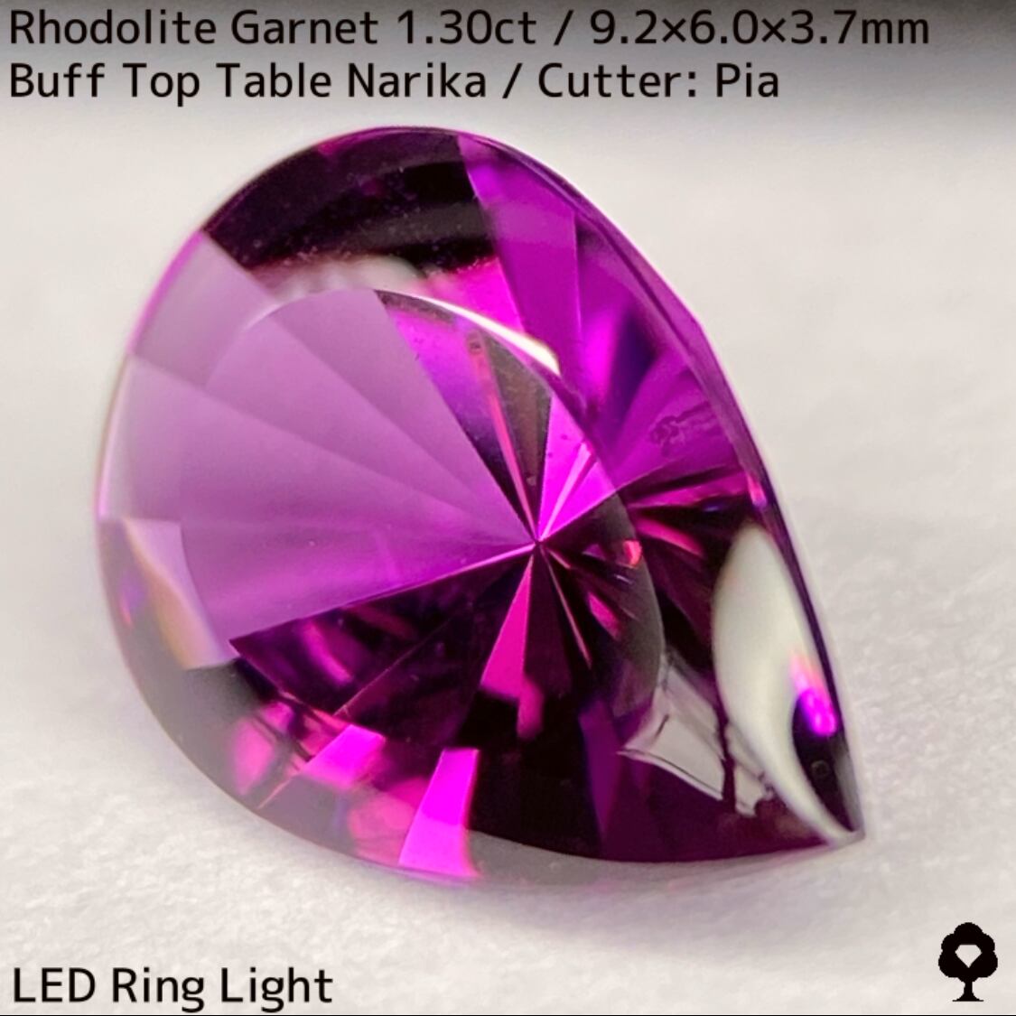 モザンビーク産の美色ピンキッシュグレープのロードライトガーネットで、ペアシェイプのクラウン側をテーブルありのバフトップにして、クラウン側をシンプルなタイ語で時計を意味するナリカーカットに仕上げた一石です。