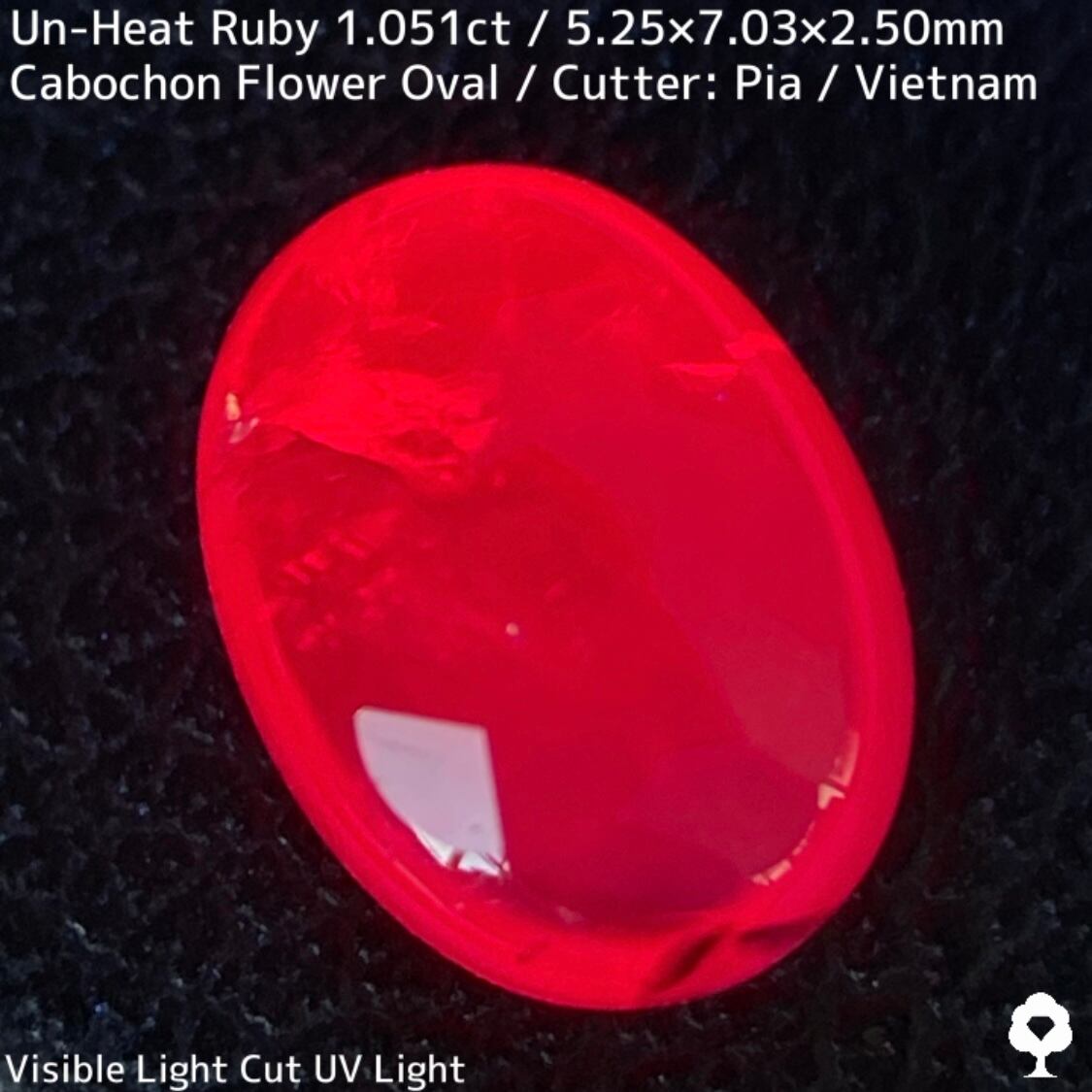 中央に虹に煌めく内包物などいくつか内包物があり表出している箇所もありますが、両面ツヤツヤのカボションに仕上げ、表面にフラワーカットを施したGTJにしかないルビーです。