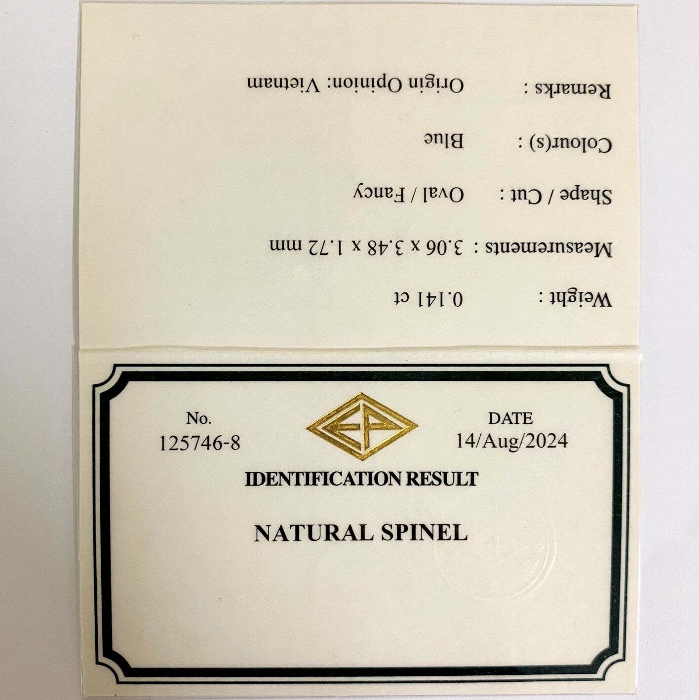スカッとした美しいライトブルーのベトナム北部のルックイェン産のコバルトスピネルで、端正なオーバルシェイプに仕上げました。