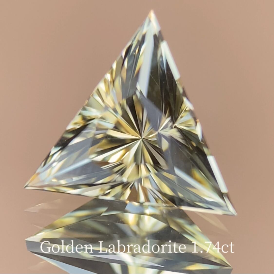 透明度の高いゴールドのスリランカ産ラブラドライトで、原石から太刀落とす部分の非常に多いトライアングルシェイプにカットして、更にパビリオン側を重さの減りがかなり大きいタイ語で時計を意味するナリカーカットに仕上げた作品です。
