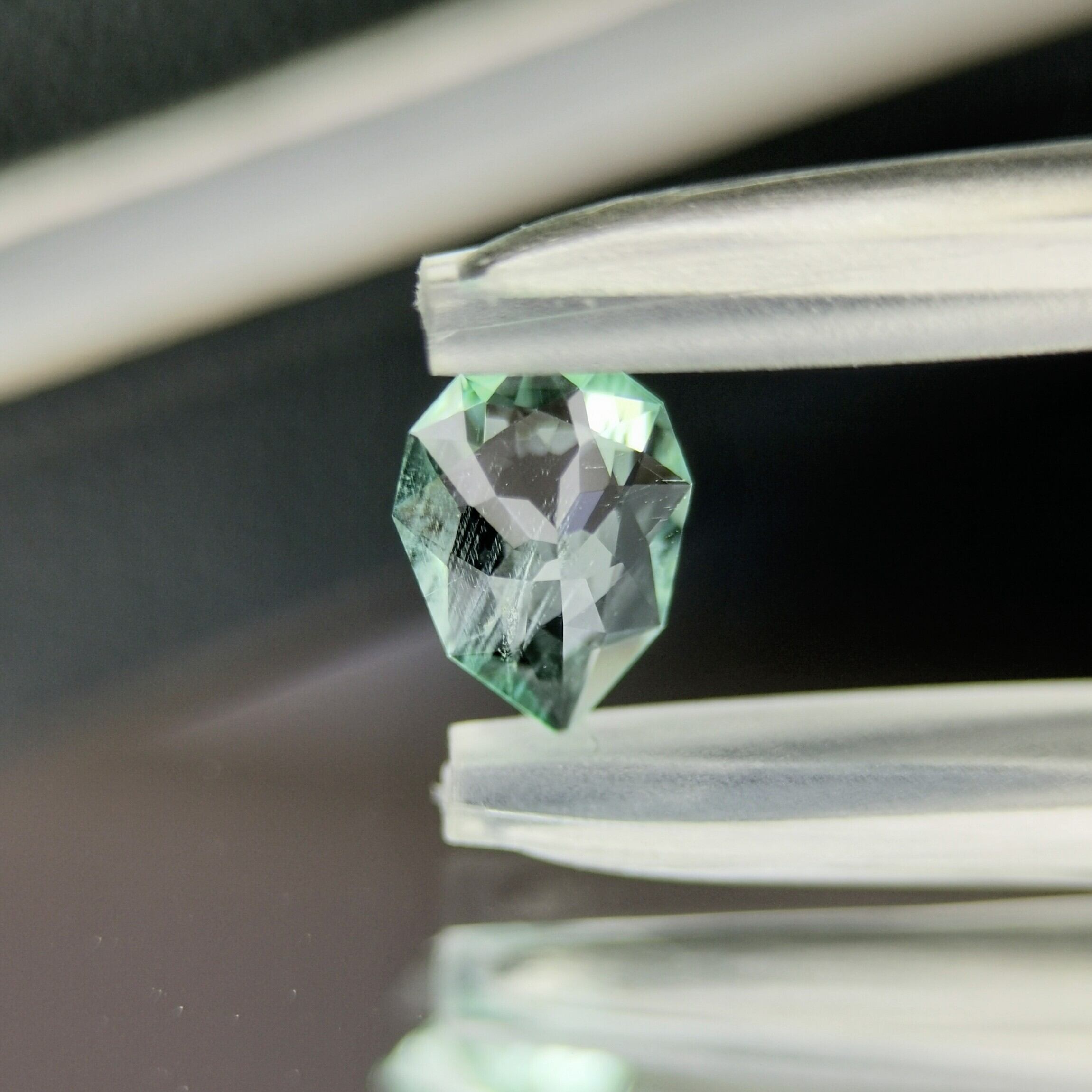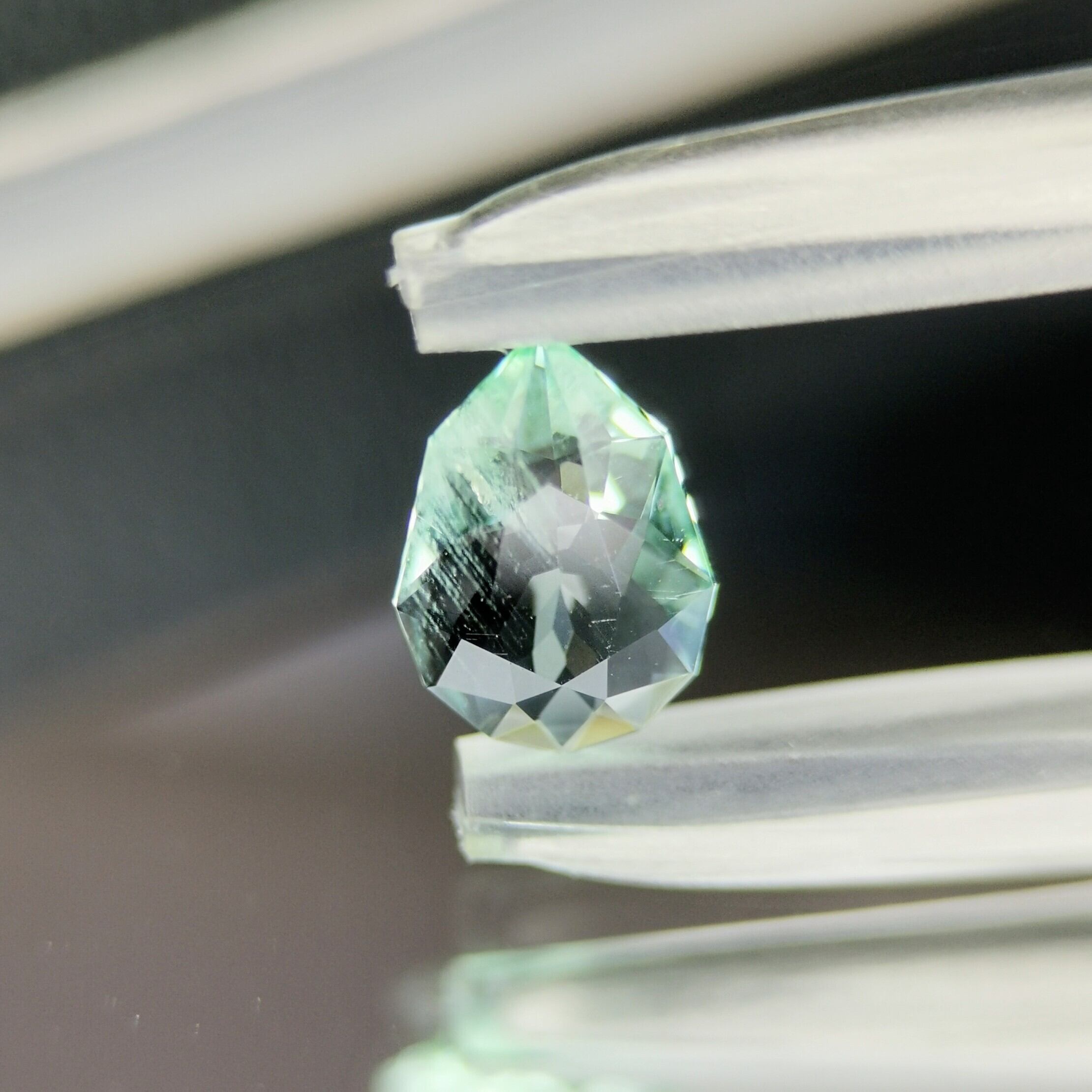 コチラの作品はベトナム産のアマゾナイトで、長石グループのマイクロクリンフェルスパーに属する石種で、宝石質のものが極めて少なく、基本的に内包物がぎっしり詰まっているものばかりで、モース硬度は6〜6.5ですが劈開が2方向に完全という性質があるためカットの難易度も非常に高く、なかなか市場に出回らない希少石です。