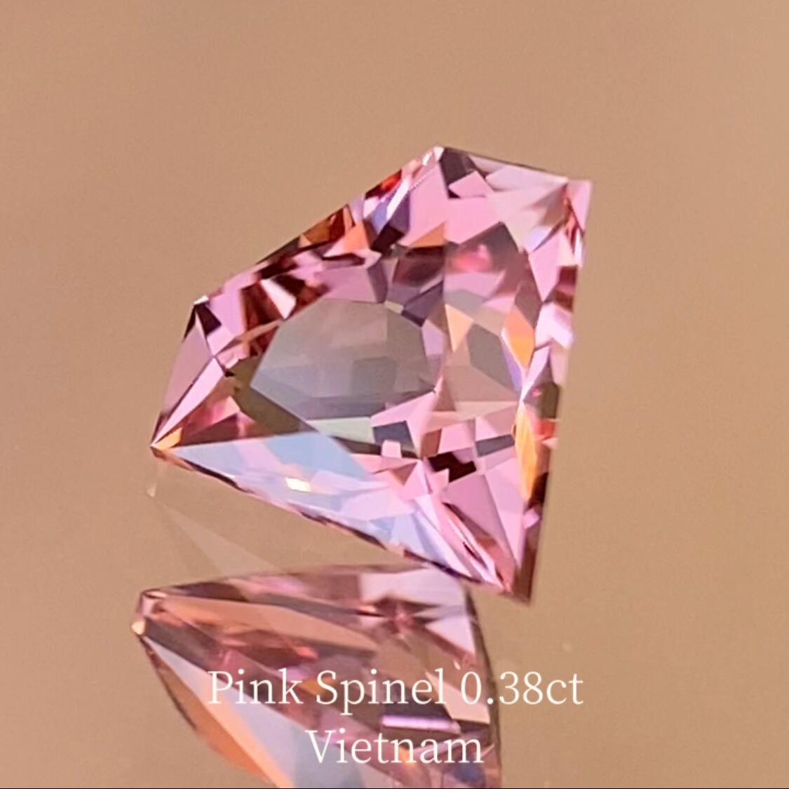 可愛らしいピーチピンクのベトナム北部ルックイェン産のスピネルで、目立った内包物のない美結晶を大人気の宝石形シェイプに仕上げた作品です。