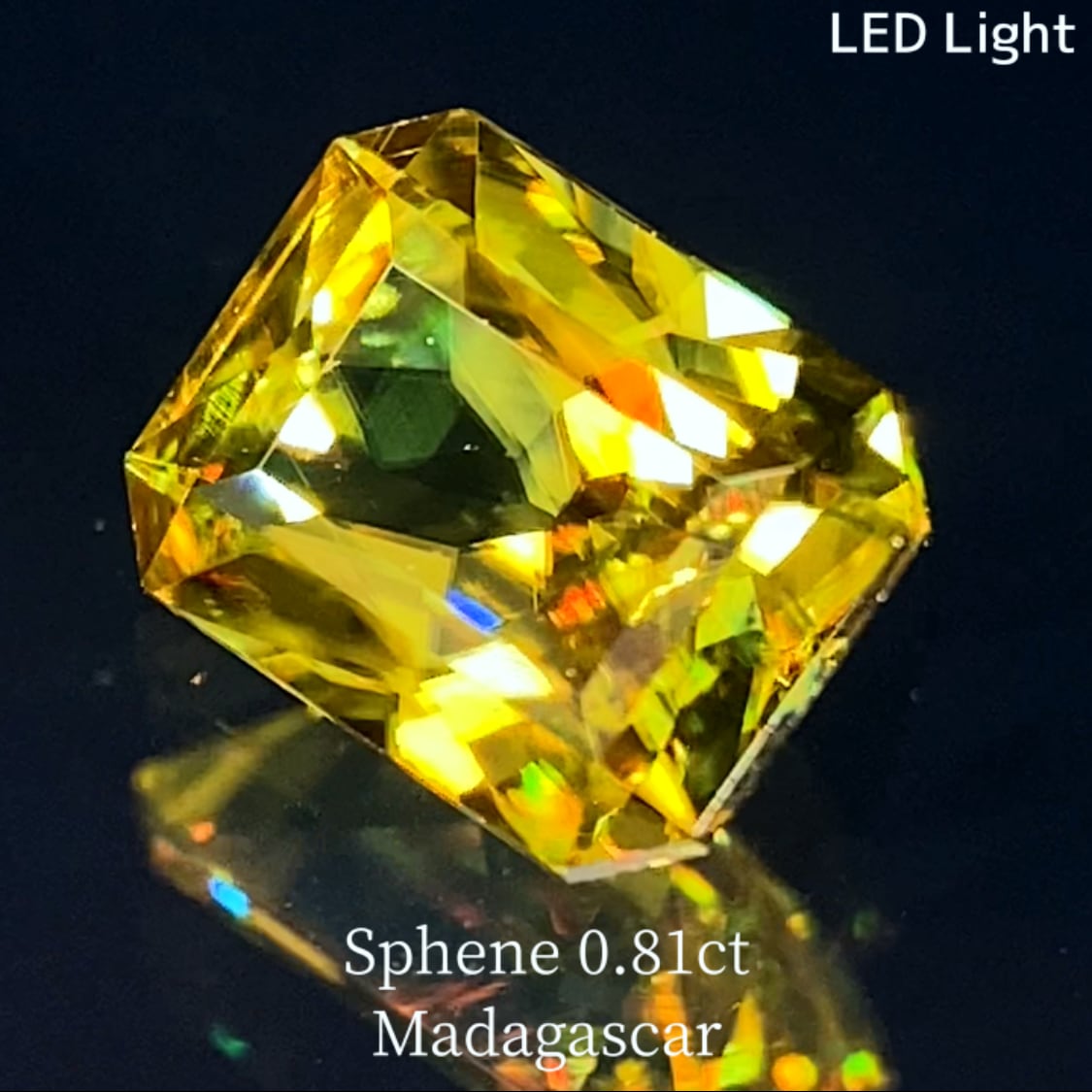 強いグリニッシュゴールドの煌めきが美しく、抜群のカットと表面のツヤによってスフェーン光の分散度の高さを最大限に引き出し、カラフルなファイアーが放たれます。