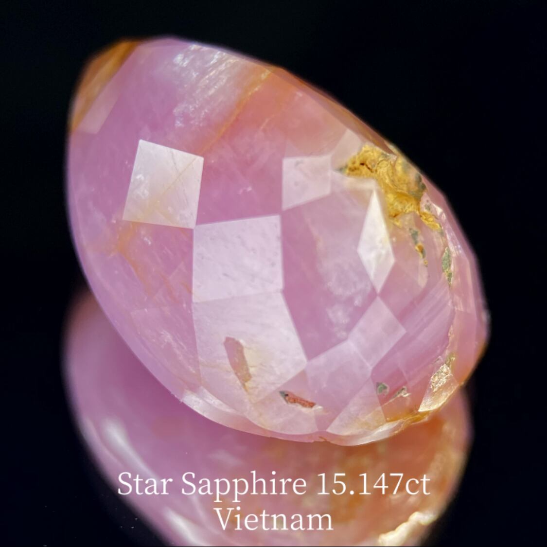 原石と宝石の間と言えるGTJ創業者大御所ならではの逸品で、クラウン側はうっすらとスターの出る面をカボションにしながら原石の趣も残し、パビリオン側には内包物の表出がありながらも最大限に端正なファセットをつけたペアシェイプのベトナム北部イェンバイ産のスターサファイアです。