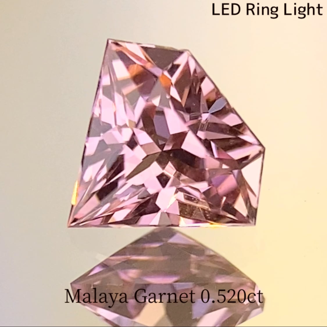 柔らかで上品なピンクのマラヤガーネットで、バランスの良い宝石形カットに仕上げた作品です。