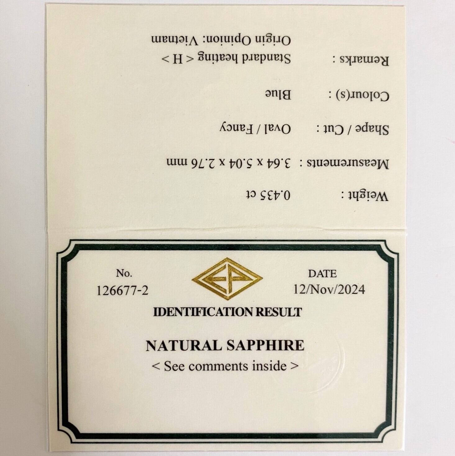 ディープなインクブルーに少しパープルが噛んだのベトナム中部産のサファイアで、端正なオーバルシェイプに仕上げられた作品です。