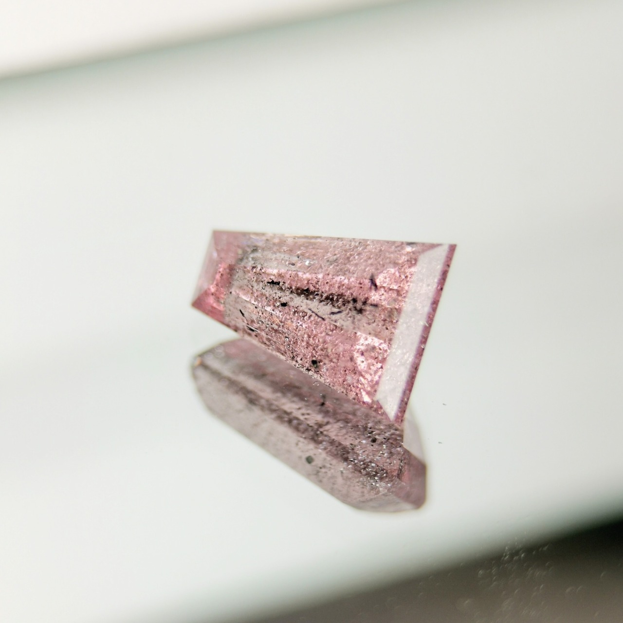 ヌードピンクの柔らかな地色に、アパタイト・グラファイト・パイライトが全体に広がるサンストーンのようなマラヤガーネットで、原石から端正なテーパーシェイプに仕上げた作品です。