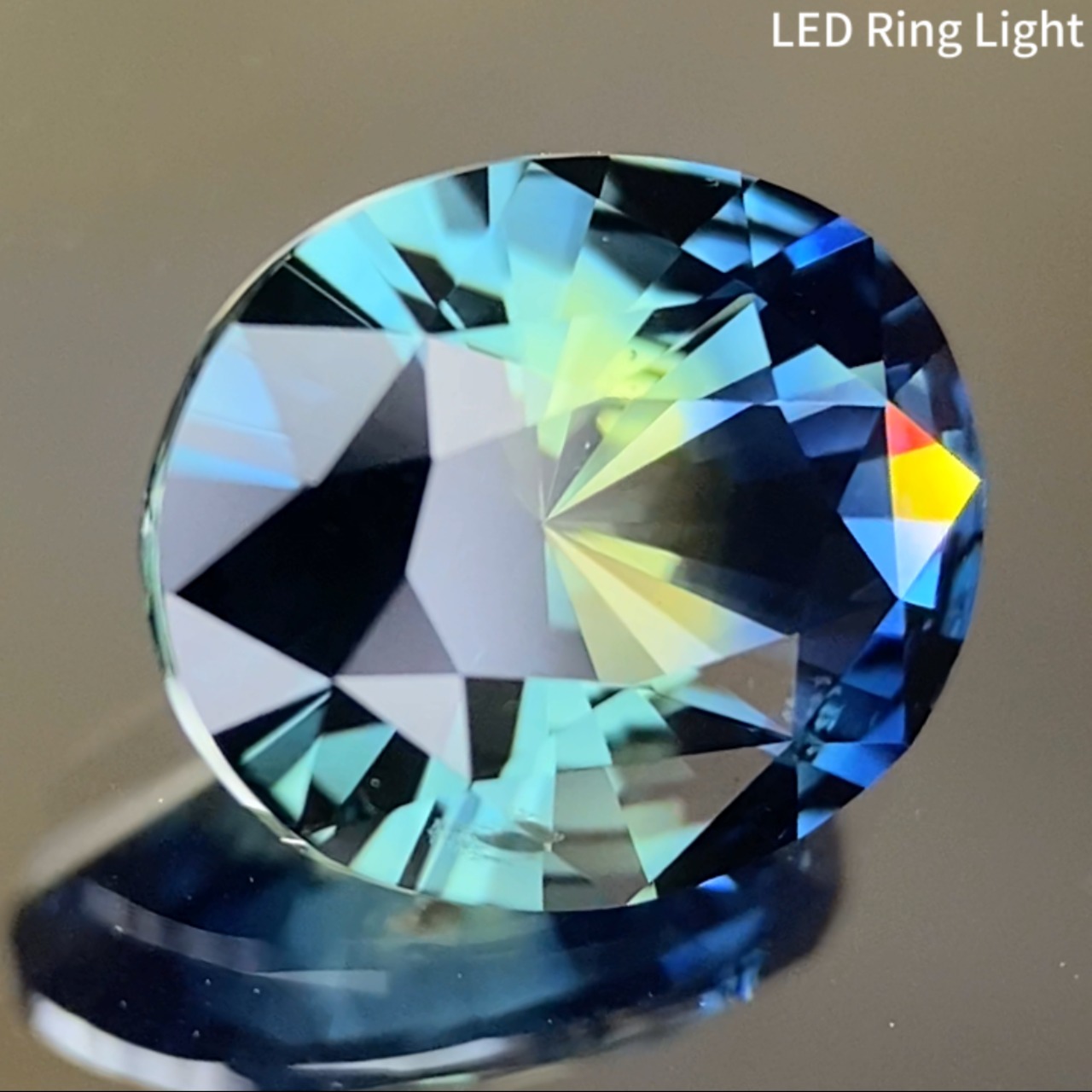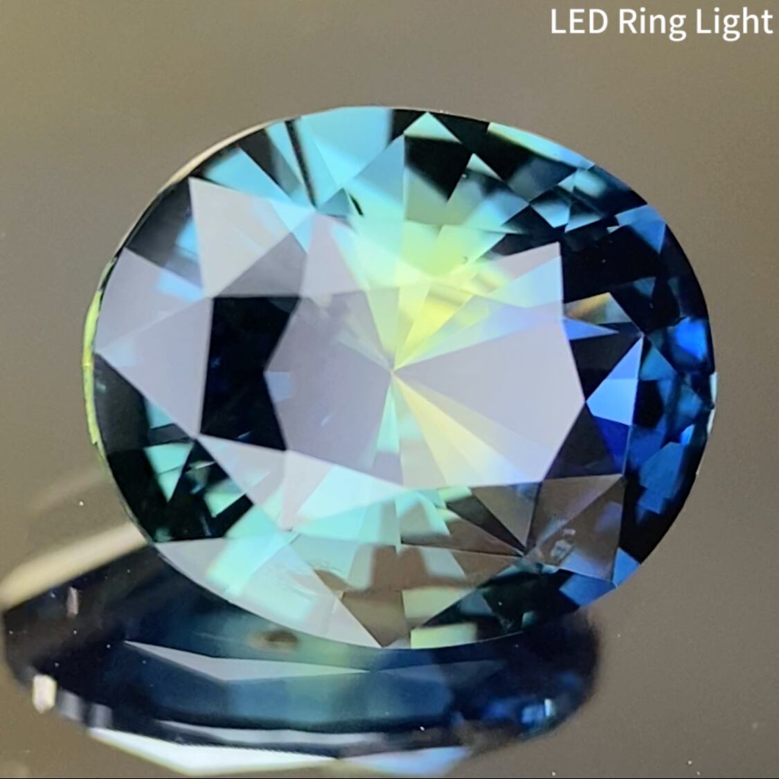 中央にイエローの色だまりがあり、両脇に深みある鮮やかなブルーが囲んでいるナイジェリア産のパーティカラーサファイアで、配色と鳥の羽根のような煌めきからピーコックサファイアと呼べる作品です。
